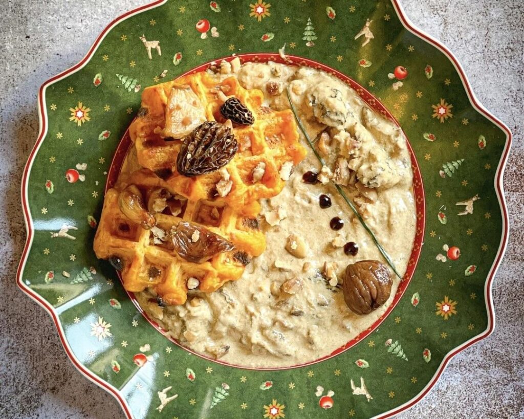La note de Mélanie : «Pour moi, Noël a parfois été une période délicate, en tant que personne végane. Alors qu’il s’agit d’un moment de partage et de convivialité, il m’est déjà arrivé de me sentir mise à l’écart parce que je ne consomme pas de produits animaux. La gaufre est un plat à la fois ludique et gourmand, capable de séduire ceux qui hésitent devant la cuisine végane. Quant à la sauce, ses saveurs hivernales et réconfortantes – champignons, vin blanc, châtaignes – évoquent instantanément l’esprit des fêtes.»