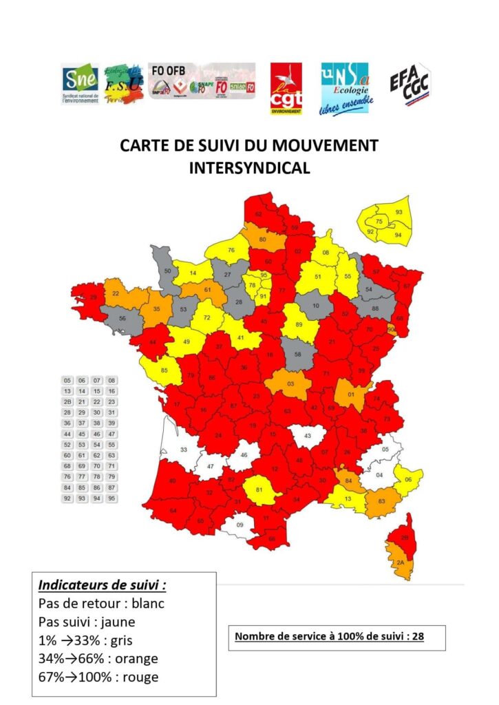 Face à cette recrudescence des tensions, les six syndicats représentés à l’OFB (SNE, FSU, FO OFB, CGT Environnement, Unsa-écologie et EFA CGC) ont constitué une intersyndicale et décrété la mise en retrait des inspecteur·ices de l’environnement, qui a débuté lundi. Les données transmises révèlent que, dans une cinquantaine de départements – en rouge sur la carte –, plus des deux tiers des agent·es suivent le mouvement.