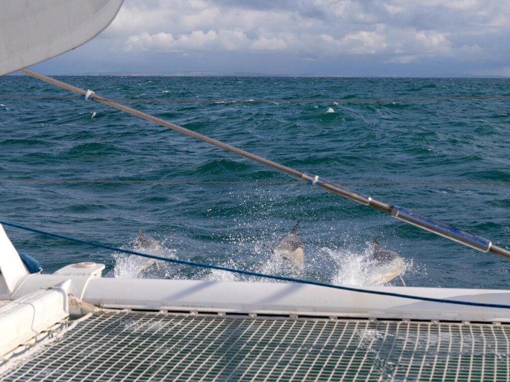 Seul sur la proue, les yeux dans l’eau, les dauphins étaient trop beaux… Non, cette scène ne se déroule pas à un concert de Roch Voisine, mais au beau milieu de la Manche. Sans se préoccuper de savoir s’ils nageaient en eaux britanniques ou françaises, les cétacés ont offert un spectacle virevoltant aux passager·es du catamaran Echoes, dont nous faisions partie mi-mars.