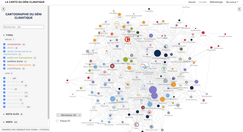 Une fois ces informations rentrées dans les fiches, les liens entre les entités apparaissent sur la carte. Une couleur est attribuée en fonction de la catégorie dont ces acteurs se rapprochent le plus : extrême droite, complotistes, droite conservatrice et réactionnaire, libéraux et libertariens ou scientifiques. Pour cette dernière catégorie, Jules Xenard précise que ce sont des scientifiques qui, le plus souvent, ne travaillent pas sur les sciences du climat.