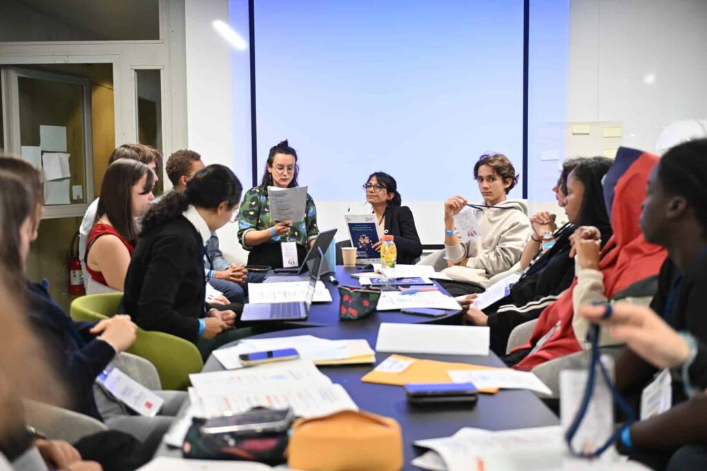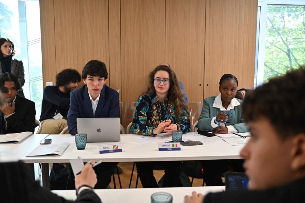 «Attends, faut que j’aille me mettre d’accord avec la France sur la question des énergies renouvelables» ; «je me suis alliée avec le Brésil ce matin, ils vont me soutenir là-dessus»… On pourrait se croire au milieu de dignitaires internationaux dans les couloirs des Nations unies. Il n’en est rien : nous sommes en plein Paris, au musée de la Marine situé au pied de la tour Eiffel et les négociateur·ices sont des élèves de seconde, première et terminale.