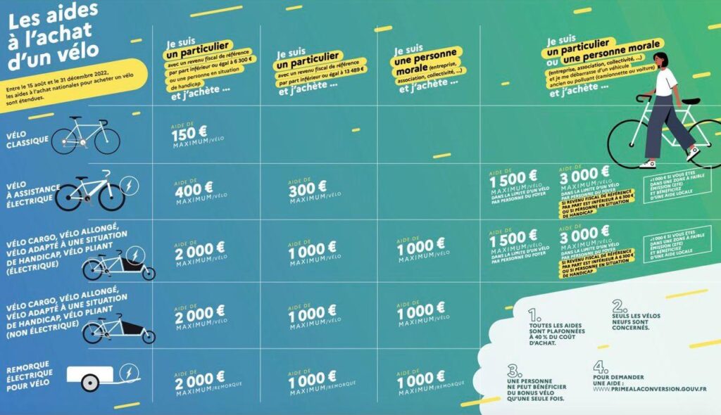 De nombreuses aides sont disponibles – renforcées cet été, elles seront reconduites en 2023, comme l’a annoncé le ministre délégué au Transport Clément Beaune. Le détail est disponible ici. Par ailleurs, de nombreuses collectivités (villes, régions) proposent également des financements qu’on peut cumuler. Vous pouvez faire le point en fonction de votre lieu de résidence sur le site « MesAidesVélo ».