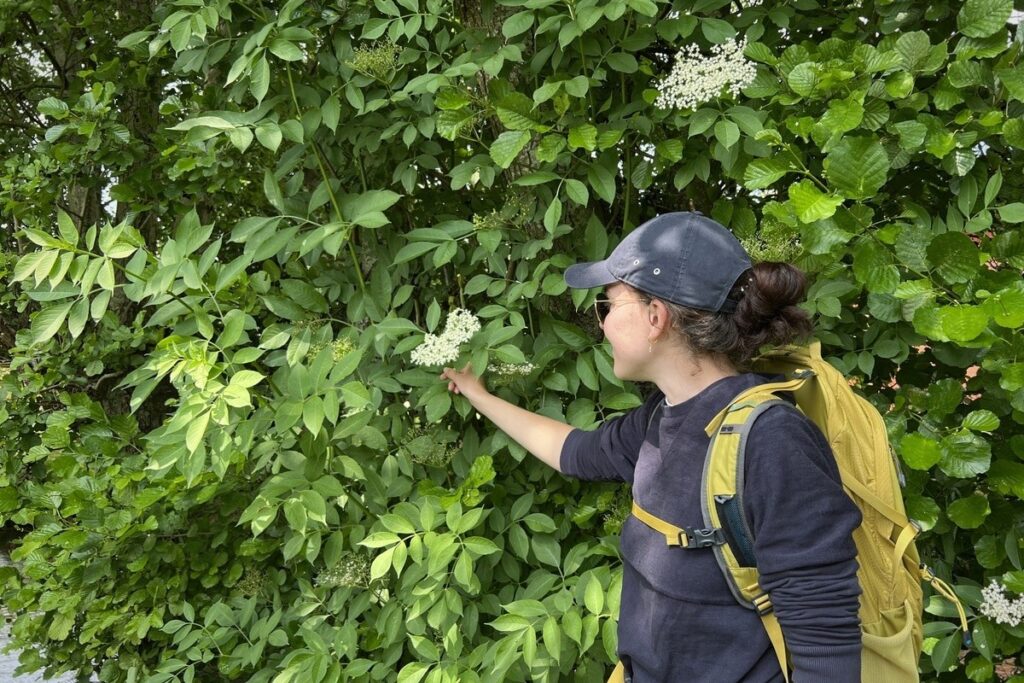 Après l’aubépine et le gaillet, Eliane Florent Giard conduit le groupe à proximité du sureau. «Il y a le sureau noir, qui produit des fruits noirs. Il y a le sureau rouge, qui fait des fruits rouges. Mais il y a aussi le sureau yèble, qui est toxique, et dont les fruits sont… noirs», énumère la guide. «Comment faire pour reconnaître le bon sureau ?», questionnent plusieurs participantes. «Le rouge et le noir sont des arbustes, alors que le yèble est une herbacée, il n’a pas de branches et ses fruits se présentent toujours vers le haut».