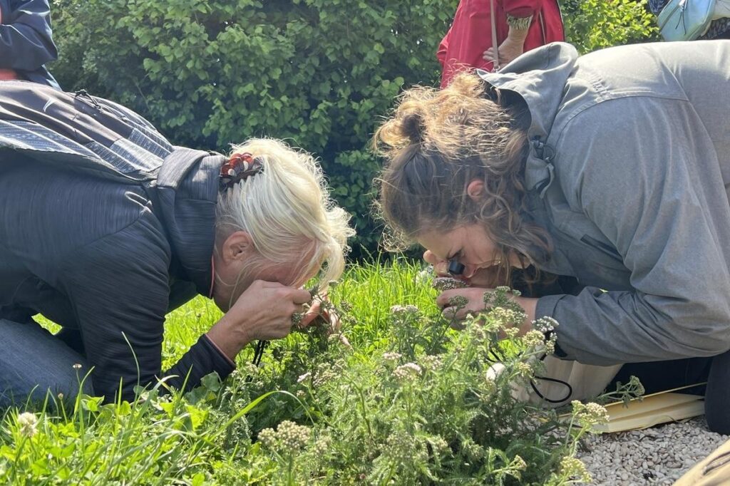 Envie d’une infusion parfumée au retour de la balade ? Le groupe fait une pause devant l’achillée mille-feuilles, ses petites feuilles très segmentées – d’où son nom – et ses inflorescences blanches. Comme pour le pissenlit ou la pâquerette, ce qu’on prend pour des pétales et des étamines sont en réalité des fleurs individuelles. «Offrir un pissenlit, c’est offrir un bouquet de fleurs», ironise l’éducatrice. Les fleurs séchées de l’achillée se consomment en tisane. Les fleurs de pâquerettes ou les feuilles de pissenlit composent une bonne salade. Toutes ces petites fleurs de nos jardins ne sont pas comestibles. Qu’on aime ou non le beurre, « le bouton d’or est toxique !»
