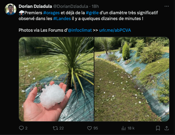 Des rafales de vent ont été enregistrées jusqu’à plus de 100 kilomètres heure pendant la nuit. Et des chutes de grêle ont touché plusieurs départements, notamment le Gers, les Landes et les Hautes-Pyrénées. «Des grêlons pouvant atteindre deux à cinq centimètres sont tombés en Normandie, et jusqu’à sept centimètres dans le sud-ouest, notamment dans les Landes», précise Ouest-France.