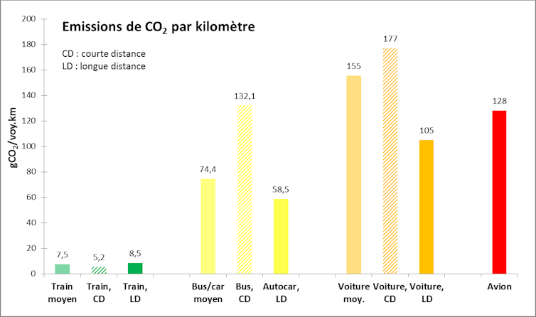 La barre de gauche représente la moyenne pour le mode, celle du milieu en hachuré seulement pour les déplacements à courte distance, et à droite les déplacements longue distance qui sont plus directement comparables à l’aérien en termes de motifs. Aurélien Bigo/Données Ademe et ENTD, CC BY-NC-ND