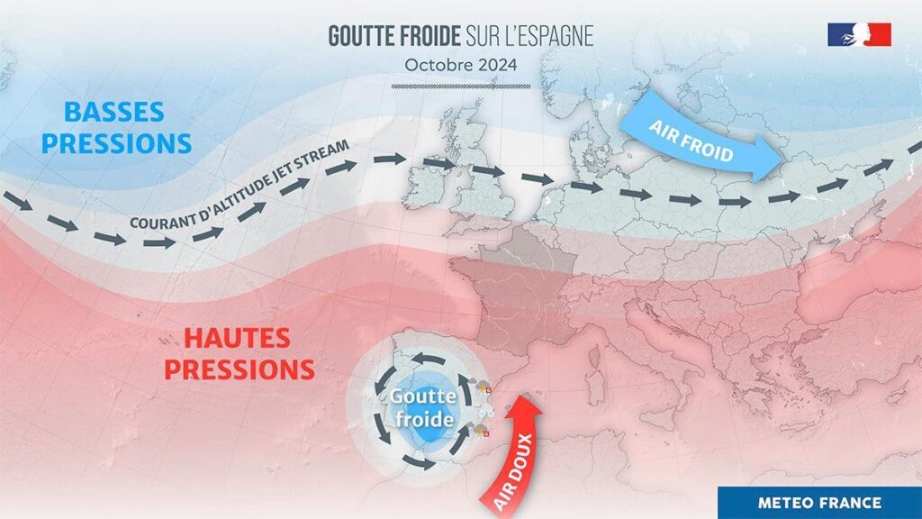 Ce désastre est dû à un épisode méditerranéen – des remontées d’air chaud, humide et instable en provenance de la mer, qui peuvent provoquer des orages stationnaires violents. Et à une «goutte froide», une dépression d’altitude, combinée à de l’air froid. Ces deux phénomènes sont courants en automne sur la côte méditerranéenne espagnole, notamment du fait de sa topographie vallonnée dans l’arrière-pays.