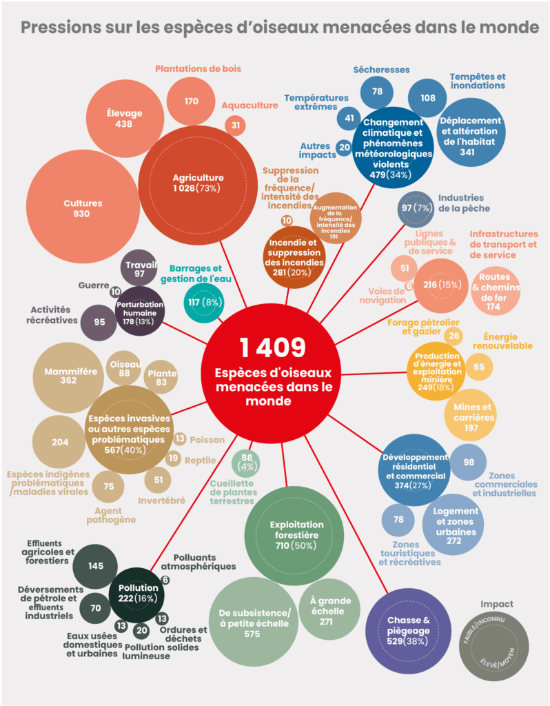 En tête des menaces, le développement de l’agriculture intensive affecte près de 73% des espèces concernées, devant l’exploitation forestière (50 %), la prolifération des espèces invasives (40 %), la chasse (38 %) et le changement climatique (34 %). Les incendies-monstres et l’urbanisation rampante sont notamment en cause. Des phénomènes qui affectent l’habitat des espèces, quand ils ne provoquent pas directement leur mort ou les empêche de se reproduire.