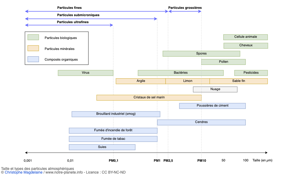 Invisibles, minuscules et fort dangereuses pour la santé, les particules ultrafines (PUF) constituent une préoccupation majeure de veille environnementale. Moins connues que les PM10 (dont le diamètre est compris entre 10 et 2,5 micromètres – µm) et les PM2,5 (entre 2,5 et 0,1 µm), ces poussières sont aujourd’hui les plus petites que l’on puisse mesurer et observer. Elles sont inférieures à 0,1 µm (soit 100 fois plus fines que les PM10), aussi grande qu’un virus ou qu’une molécule d’ADN.