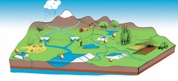 1. Bassine alimentée par pompage dans la nappe. 2. Bassine alimentée par pompage dans la rivière. 3. Retenue collinaire. 4. Retenue en dérivation. 5. Barrage.