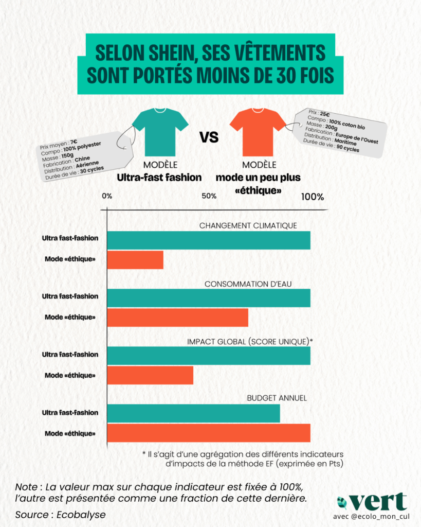 Sur une année d’utilisation, entre de l’ultra fast fashion à six ou sept euros le t-shirt et un modèle conçu pour durer un peu plus longtemps à 25 euros, l’impact moyen sur l’environnement est deux à six fois supérieur – pour un prix d’achat annuel similaire.