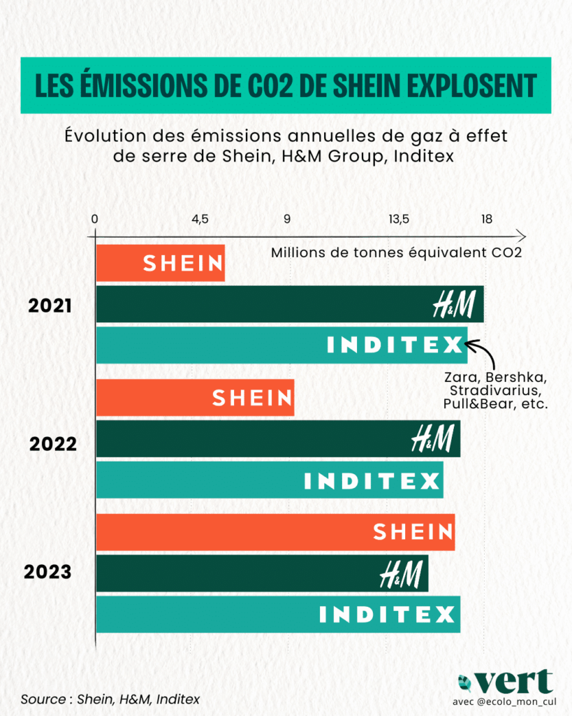 La firme a multiplié par deux ses émissions de gaz à effet de serre (GES) en trois ans, détrônant les pionniers du secteur comme H&M ou Zara, et faisant de Shein la marque de vêtements qui – du point de vue des émissions carbone – pollue le plus aujourd’hui. Difficile dès lors de tenir l’objectif annoncé un an plus tôt de 25% de réduction de ses émissions d’ici à 2030.