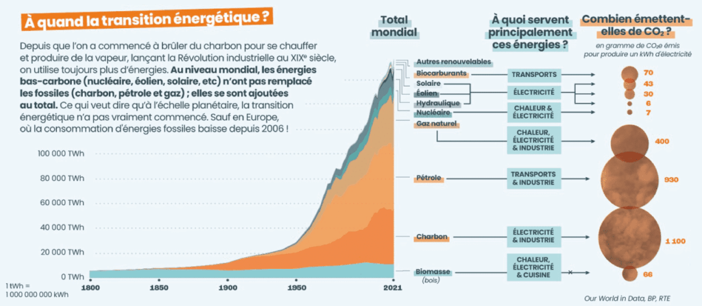 «Le débat se concentre au mauvais endroit», remarque d’emblée Thomas Veyrenc, directeur exécutif du gestionnaire du réseau électrique français RTE, sous les plafonds peints de l’Académie du climat. En France, les discussions politiques se focalisent sur l’électricité alors que celle-ci ne représente qu’un quart de toute l’énergie consommée. Moins visibles, les fossiles composent encore la majorité de notre énergie. «Un français en moyenne consomme près de 2 tonnes de ressources fossile par an», précise l’ingénieur et vulgarisateur Rodolphe Meyer, alias «Le Réveilleur».