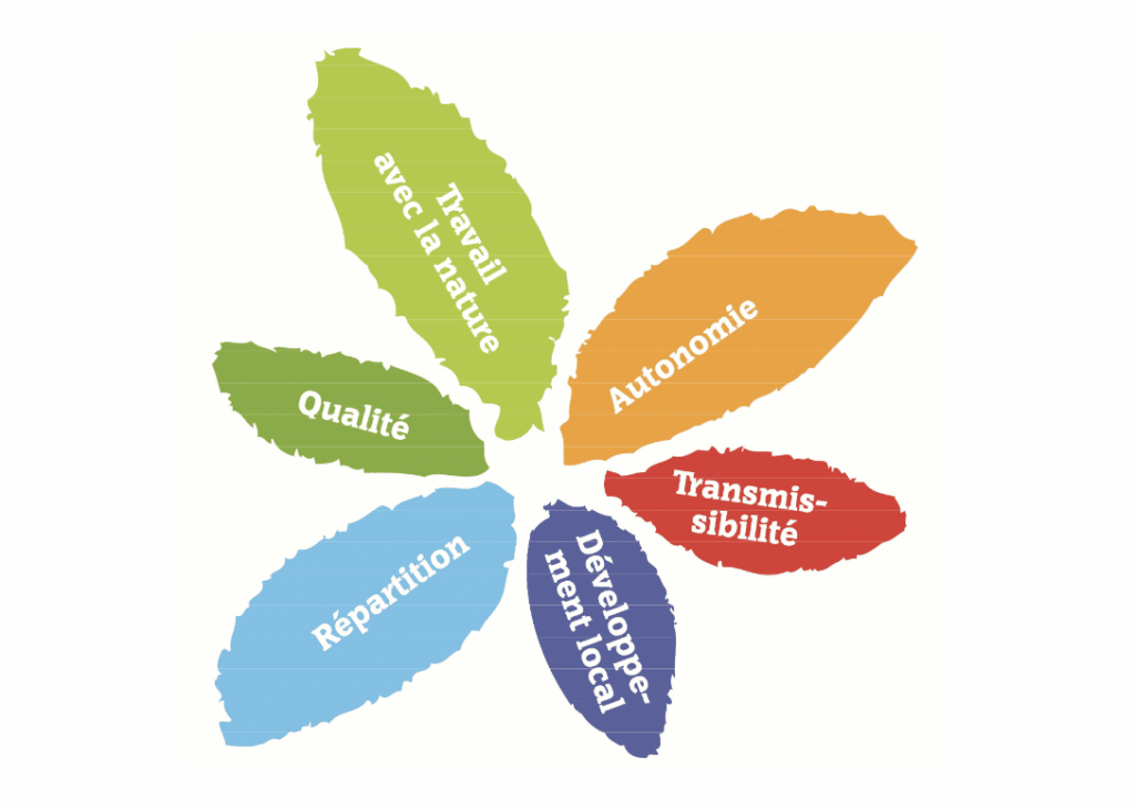 En 1998, des paysan·nes et scientifiques ont abouti à son cadrage à travers la rédaction d’une charte, qui compte dix principes (regroupés en six pétales qui forment aujourd’hui le logo de la Fadear) :