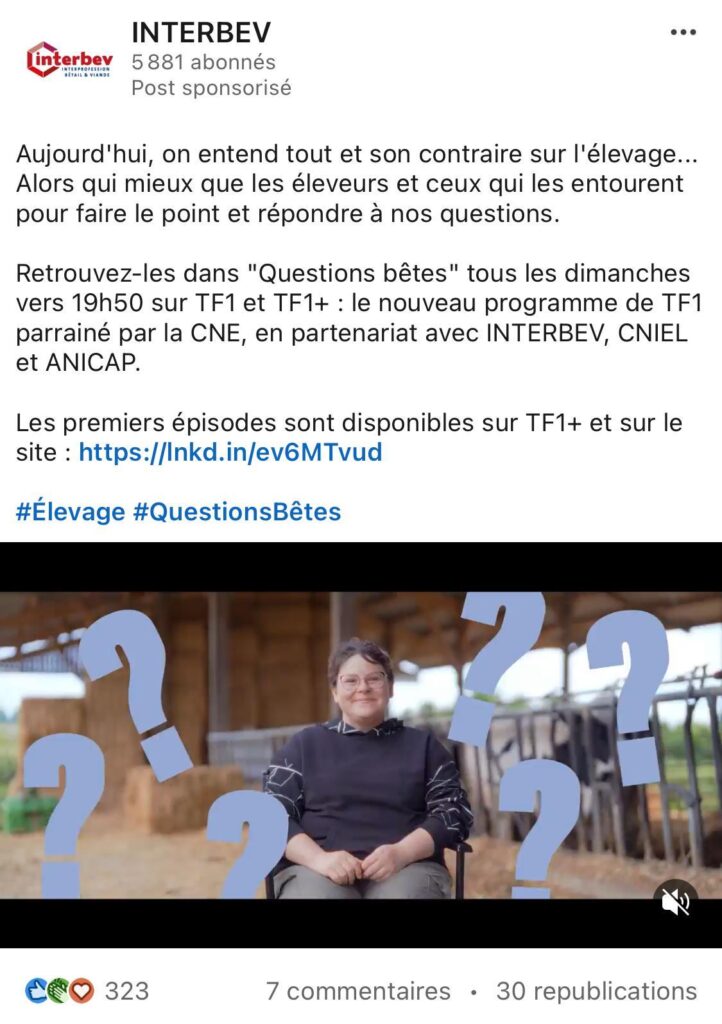 Son sigle (CNE) est mentionné, mais pas explicité en toutes lettres avant la fin de l’épisode. Trois autres interprofessions (lobbys) partenaires de ce programme – Interbev (viande bovine), le Cniel (producteurs de lait) et l’Anicap (filière lait de chèvre) – ne sont pas mentionnées du tout. Contactées par Vert, la CNE et Interbev n’ont pas répondu à nos questions sur la nature, notamment financière, de ce partenariat.
