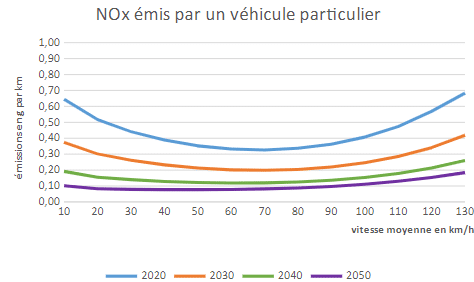 Les véhicules thermiques sont optimisés pour consommer le moins de carburant et émettre le moins d’oxydes d’azote (NOx), un gaz à effet de serre, à une vitesse moyenne de 70 km/h. Si les émissions sont élevées dans le cas de faibles vitesses moyennes, c’est car elles vont généralement de pair avec une conduite en ville, où les redémarrages et la congestion du trafic génèrent des émissions importantes. © Centre d’études et d’expertises sur les risques, l’environnement, la mobilité et l’aménagement