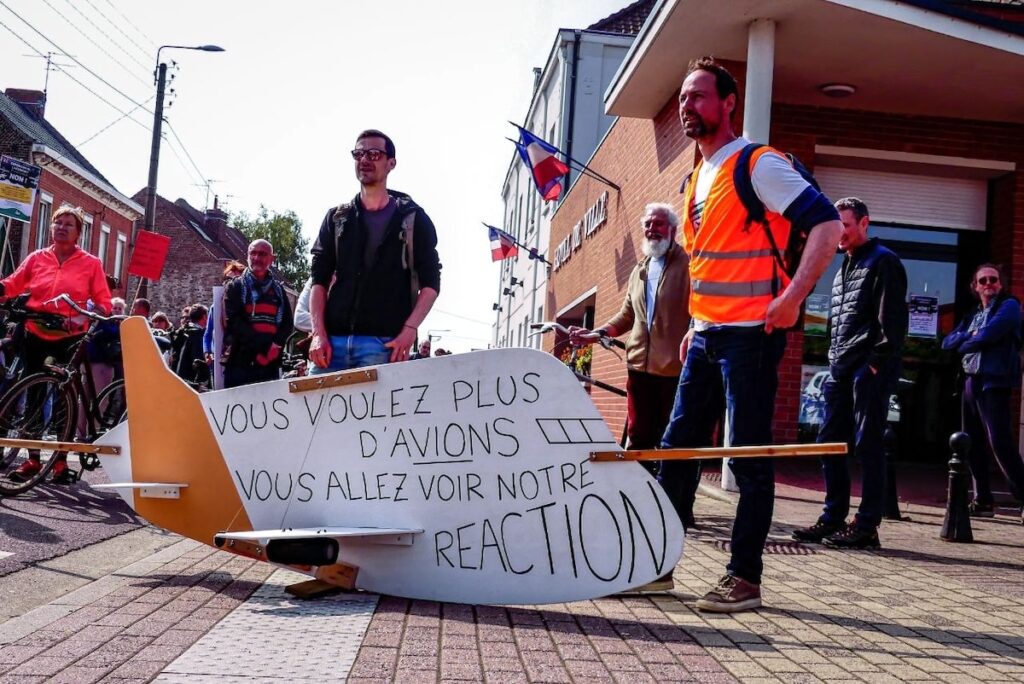 Nice, Lille, Beauvais, Toulouse, Montpellier, Nantes… Plus d’une vingtaine de villes sont mobilisées ce mercredi et vendredi dans le cadre d’une vaste campagne. Alors que le trafic aérien a retrouvé son niveau de 2019, avant la pandémie de covid-19, et que les acteurs du secteur prédisent un doublement du trafic d’ici à 2040 (notre article), ces actions coordonnées visent à «montrer que la croissance du trafic aérien est insoutenable et dangereuse pour la santé et le climat», détaille Charlène Fleury, coordinatrice du réseau Rester sur terre.