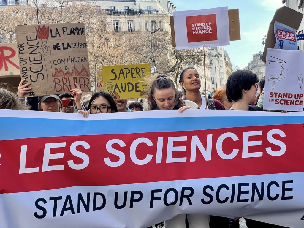 Le 7 mars 2025, à Paris, des scientifiques réuni·es pour défendre la recherche face aux attaques de Donald Trump. ©Justine Prados/Vert