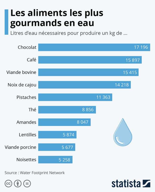 On peut aussi se renseigner sur l’« empreinte eau » de notre alimentation et de nos achats – les volumes nécessaires pour les produire. L’agriculture consomme environ 80 % des ressources mondiales (FAO), l’industrie 20 % et seulement 10 % sont dévolues à nos usages domestiques. Selon les différentes études réalisées par le Water Footprint Network (celle-ci sur l’élevage, celle-là sur les cultures), il faut en moyenne 17 196 litres d’eau pour faire un kilo de chocolat, 15 897 litres pour un kilo de café, 15 415 litres pour un kilo de bœuf et 2 500 litres pour un t-shirt en coton, en prenant en compte l’eau nécessaire pour faire pousser les céréales dont se repaissent les animaux et les eaux de pluie stockées dans les sols. On peut faire le point sur l’empreinte de différents produits selon cette méthode de calcul en cliquant ici, ou calculer ici son « empreinte eau» de manière plus large, en évaluant sa consommation (en anglais). Il existe cependant différentes méthodes de calcul, en fonction des conditions climatiques locales, de la prise en compte ou non de l’eau pluviale… En France, l’Inrae évoque plutôt le chiffre de 550 à 700 litres pour le bœuf.
