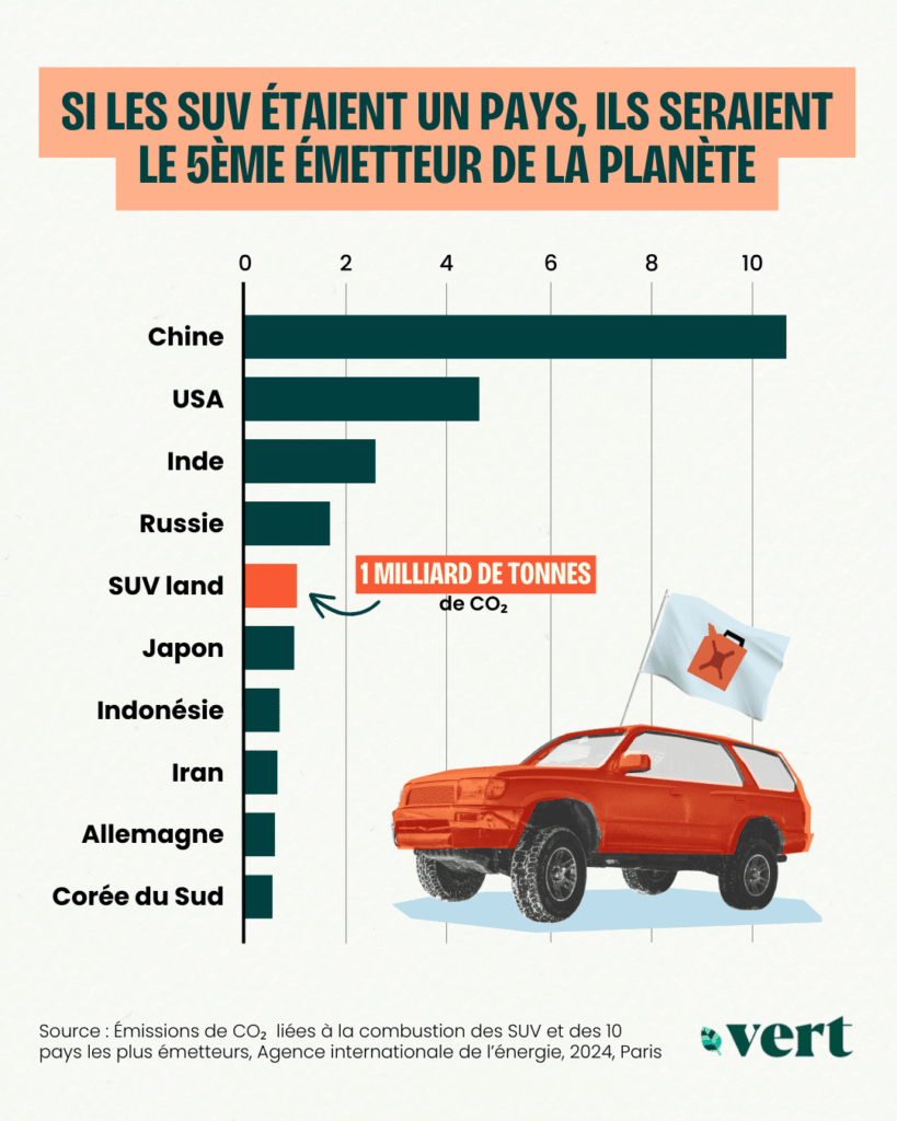 Ces «véhicules utilitaires sportifs» ont émis un milliard de tonnes de CO2 rien qu’en combustion de carburant en 2023, selon l’Agence internationale de l’énergie.