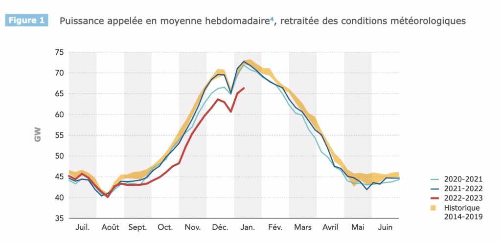 Une embellie qui n’est pas du seul fait de cet hiver tiédasse. La baisse observée par rapport à la moyenne de la même période entre 2014 et 2019 est « à température normale », c’est-à-dire corrigée des variations de la météo. Elle est constatée dans tous les secteurs, de l’industrie aux ménages.