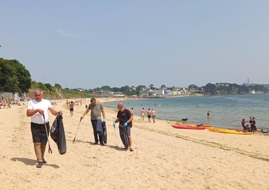 Coup de chaleur sur Brest (Finistère), en cette belle journée de la mi-juin. La plage du Moulin Blanc est pleine et, au milieu des parasols et des serviettes, un petit groupe d’hommes détonne. Jeans, baskets, gants, sacs-poubelle et pinces à la main, ils arpentent la plage sous un soleil de plomb. Sous le regard amusé ou interrogateur des baigneur·ses, ils ramassent mégots et bouts de plastique.