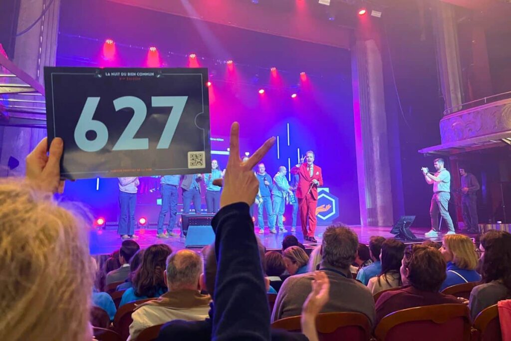 À Paris, la soirée nationale de La Nuit du bien commun était d’abord prévue comme chaque année à l’Olympia (propriété de Vivendi, le groupe d’un autre milliardaire d’extrême droite, Vincent Bolloré), qui compte 2 000 places. Mais elle a été reprogrammée aux Folies Bergère (une salle également contrôlée par Vincent Bolloré), où il y a 1 700 places. Remplir la salle était l’une des inquiétudes des organisateur·ices. «À l’approche du grand soir, nous sommes tournés vers une priorité : faire salle comble !» écrivaient-elles et ils dans un e-mail que les participant·es ont reçu après avoir validé leur place.