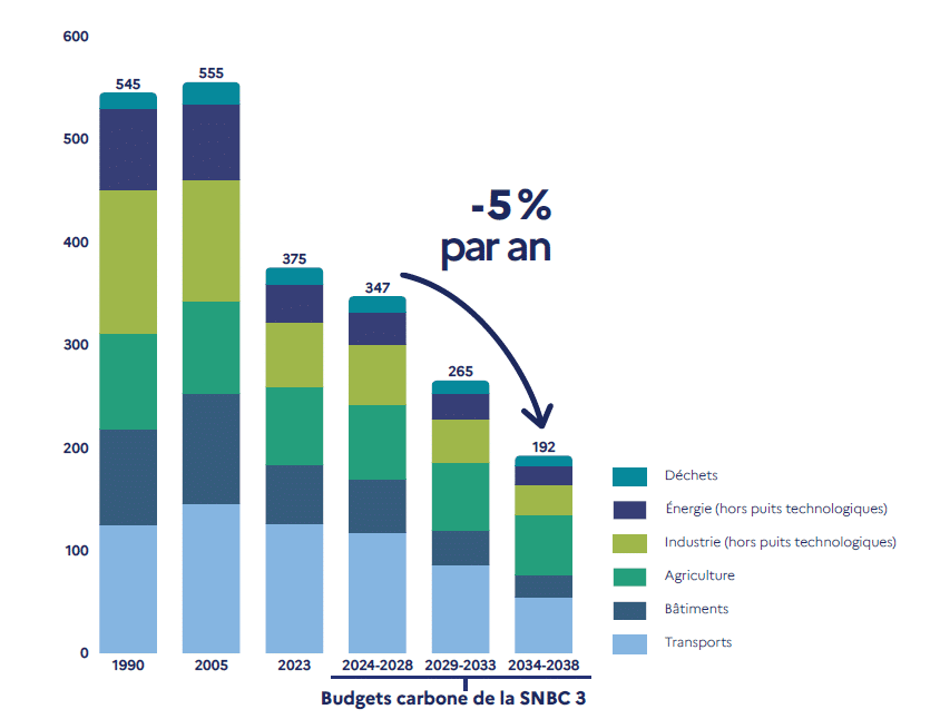 Le document prévoit que les voitures électriques atteignent 15% du parc roulant en 2030, contre 2,9% aujourd’hui. La baisse des émissions pour l’industrie est fixée à 68% d’ici à 2030 et 97% d’ici à 2050 (par rapport à 2023). Même chose pour le bâtiment qui doit atteindre -60% en 2030 et -97% en 2050 (toujours par rapport à 2023).