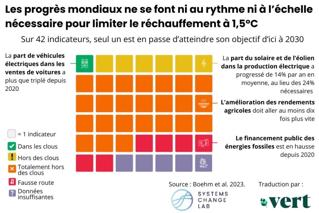 Presque du climat. En prévision de la 28ème conférence mondiale (COP28) sur le climat, plusieurs organisations environnementales ont passé à la loupe l’avancée de la transition écologique mondiale. Sur 42 indicateurs analysés, 41 révèlent des tendances insuffisantes, très insuffisantes, voire carrément à contresens.