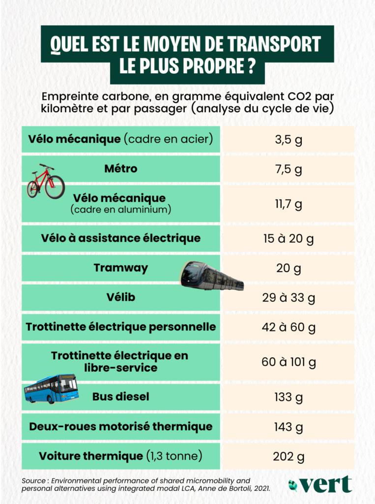 Dans son analyse sur le cycle de vie de 2021, Anne de Bortoli estimait l’empreinte carbone des trottinettes électriques individuelles à 60g eCO2/kilomètre pour les modèles d’entrée de gamme, à la durée de vie plus courte, et à 42g eCO2/km pour les trottinettes de meilleure qualité. En 2019, l’Ademe arrivait au résultat moins élevé de 24,9g CO2e/kilomètre. Là encore, c’est l’étape de fabrication qui représente la majorité de l’empreinte carbone (92%), et notamment le cadre, également en aluminium. Par ailleurs, les trottinettes électriques comportent davantage d’électronique, puisqu’elles ne fonctionnent pas à l’aide d’une assistance mais d’une commande électrique, avec une carte mère. «Surtout, la longévité kilométrique d’une e-trottinette est moins grande que celle d’un VAE. Peut-être du fait de la batterie, qui est davantage sollicitée», précise Anne de Bortoli.