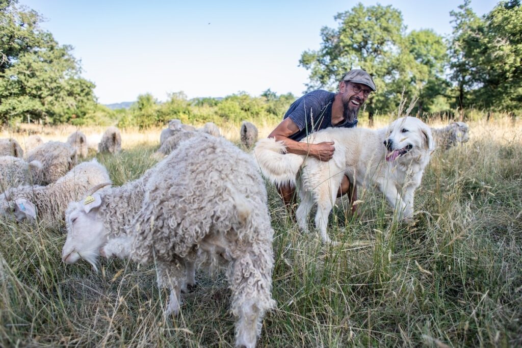 À Loubressac, dans le nord du Lot, Julien Taillefer, éleveur de chèvres angoras, accueille le groupe. Il n’a pas subi d’attaque, mais reste vigilant. Reconnaissables à leur long pelage soyeux, ses chèvres quémandent des caresses et glissent leur museau dans les sacs des visiteur·ses.