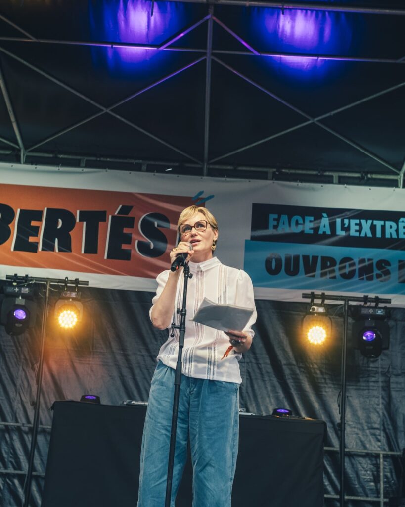 L’actrice Judith Godrèche, lors de la mobilisation contre l’extrême droite, Place de la République, le 27 juin 2024 © Yann Castanier/Vert