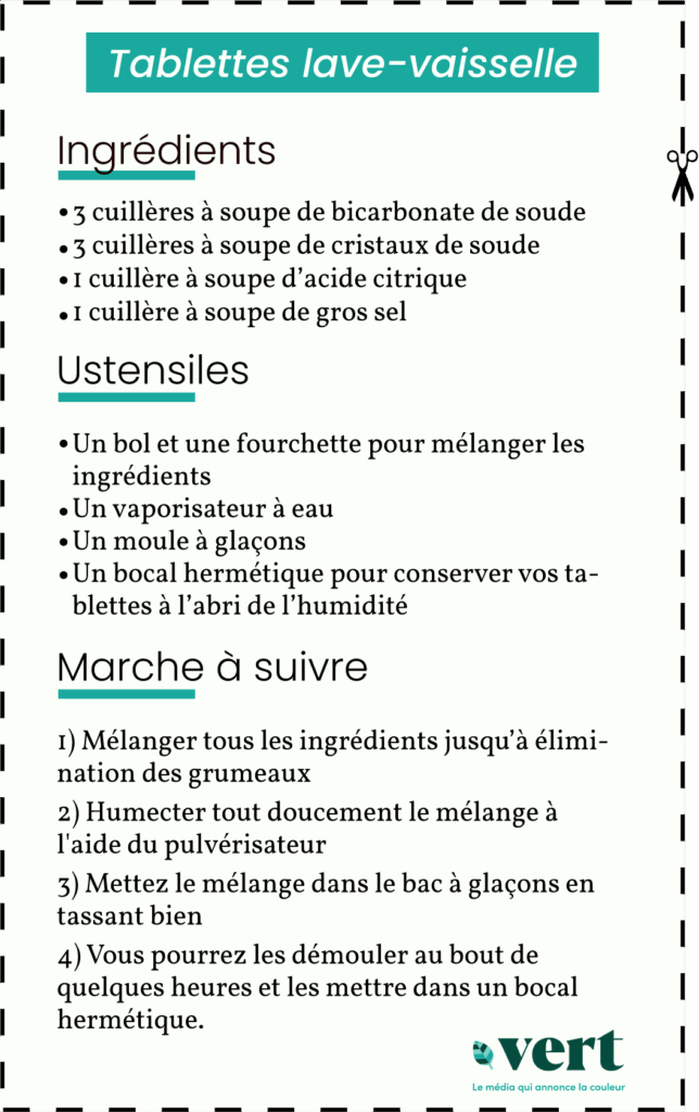 Le vendredi, chez Vert, c’est le jour du Do it yourself (faites-le vous-même) ! Aujourd’hui, voici la recette de pastilles lave-vaisselle bon marché et écologiques.