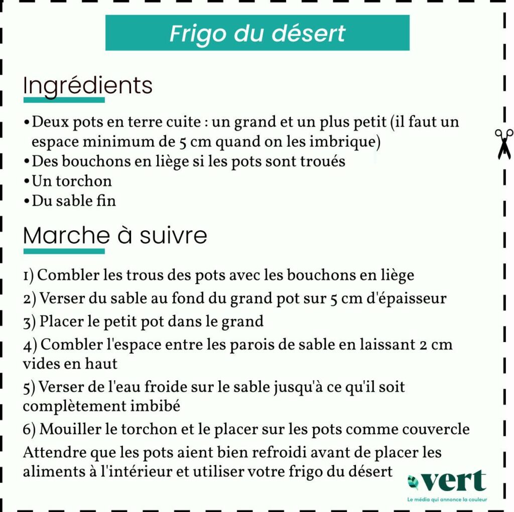 Le vendredi, chez Vert, c’est le jour du Do it yourself (faites-le vous-même) ! Alors que le thermomètre s’affole, voici une solution «low tech» largement éprouvée dans de nombreux pays chauds pour garder sa nourriture au frais sans électricité : le frigo du désert. Retrouvez aussi cette notice en images dans cette vidéo du Low tech lab.