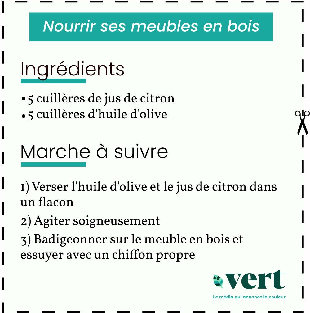 Le vendredi, chez Vert, c’est le jour du Do it yourself (faites-le vous-même) ! Aujourd’hui, on vous propose une recette simplissime qui vous permettra de nourrir vos meubles en bois pour une bouchée de pain.