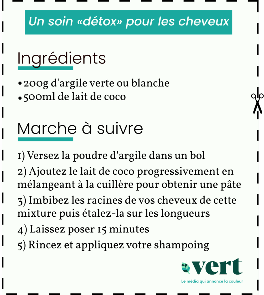 Le vendredi, chez Vert, c’est le jour du Do it yourself (faites-le vous-même) ! Avec le temps, nos cheveux se chargent de particules de pollution, de résidus de pesticides et de toxines en tout genre. Aujourd’hui, on vous propose de quoi faire le ménage sur vos têtes avec cette recette de soin « détoxifiant » pour les cheveux glanée sur la page Peau neuve.