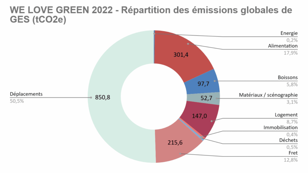 Si une infime minorité (0,6%) se rend à We love green en avion, elle représente 60% des émissions de gaz à effet de serre (GES) du transport des festivaliers en 2022. 6% viennent en voiture (35% des émissions de ce poste). Le festival We love green présente l’avantage d’être facilement accessible en transports en commun et à vélo pour les habitant·es de région parisienne. Les concerts se terminent avant la fermeture des métros.