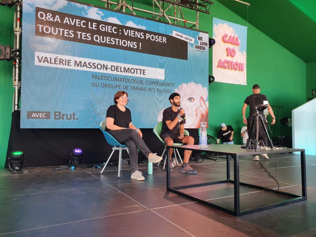 À We love green, les imaginaires sonnent et dissonent : sur les grandes scènes défilent des artistes internationaux en tournée, pendant que sous un chapiteau s’enchaînent des interventions pointues pour alerter sur l’effondrement de notre monde. Parmi les invité·es, la climatologue et coprésidente du GIEC, Valérie Masson-Delmotte, l’économiste de la décroissance Timothée Parrique, le spécialiste des risques systémique Arthur Keller ou l’ingénieure géologue Aurore Stéphant. Vert était aussi invité pour parler des nouveaux médias écolos, aux côtés de Bon Pote et Climax.