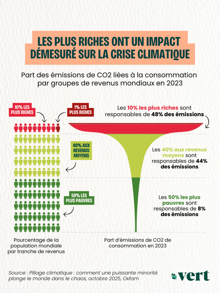 Parmi les 0,1% les plus riches, une personne émet en moyenne plus de 800 kg de CO2 par an, contre seulement 2 kg annuels pour une personne appartenant à la moitié la plus pauvre de la population mondiale. «Et ce n’est pas qu’une photographie, c’est une tendance qui s’aggrave», alerte auprès de Vert Alexandre Poidatz, responsable plaidoyer Climat et Inégalités chez Oxfam France.